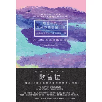 嚴選自雜誌專欄文章,《簡單生活,生命中的快樂小事》(O’s Little Book of Happiness)收錄40篇知名作家與名人撰寫的幸福人生提案,包括《享受吧!一個人的旅行》作者伊莉莎白.吉兒伯特(Elizabeth Gilbert)、《脆弱的力量》的作者布芮尼.布朗(Brené Brown)等當今文壇暢銷作家的親身經驗與人生故事。從生命成長、享受美食、戀物藏物、散步慢活、園藝生活……,生動優美的敘事文風,言淺意深的生命智慧,傳遞著讓人生變更美好的幸福快樂源泉,十分發人省思。