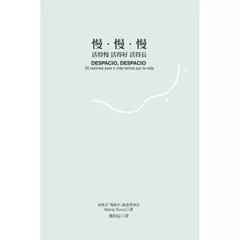 甜蜜巴黎 魔術頭巾人生是由時間構成,生命中有價值的事情幾乎全都不用花錢——鄉下的日出、小孩的擁抱、愛人的親吻、海邊的漫步……,想要充分體驗這一切,唯一需要的就只是時間。這本小書,所談的是一種新的時間修養。時間並非一成不變,而是我們以不同態度跟時間周旋的結果。人是時間的產品,既是自己已經活過的時間──自己的經歷──也是自己剩下來的時間,現在與未來。衡量時間的價值,最好的尺度就是愛,各種各樣的愛,看你放了多少時間在上面。快樂是一個時間問題,只有把時間放在真正重要的事情上,每一件與愛和被愛相關的事,人生才能充滿美,內心才有真情律動。採用另一種步調,欣然活在當下,時間乃為之延展,並與我們攜手合作,滋潤我們以安詳、平和、寧靜,以及更為美好的人際關係。為什麼要慢?因為我們失落了靈魂。我們慢慢來,並不是因為我們做事慢,而是因為我們給自己時間,慢慢思考自己想要做的是什麼,傾聽自己身體的內在節奏並與它們同步,就是在培養健康與幸福。作者簡介Maria Novo西班牙「慢郎中」協會(Asociacion espanola《Slow People》) 的理事長,也是哲學與教育博士,聯合國教科文組織的環境教育教授,活躍於拉美、西班牙及歐洲的慢活運動者。目前為ECORATE計畫主持人,這個計畫包括一項永續宣言,其目的在於結合科學與藝術,處理環境的複雜性。譯者簡介鄧伯宸成功大學外文系畢業,曾任報社翻譯、主筆、副總編輯、總經理,獲中國時報文學獎附設胡適百歲誕辰紀念徵文優等獎。譯作有《影子大地》、《孤獨的聆賞者》、《族群》、《綠色全球宣言》、《邱吉爾的黑狗》、《換一種角度看美》、《舊歐洲、新歐洲、核心歐洲》、《生活之道》、《男子氣概》、《德蕾莎修女教我的事》、《哭泣的橄欖樹》、《塔利班與女裁縫》、《印度 美麗與詛咒》(以上皆由立緒文化出版)。2017年度暢銷書來了-心理勵志慢.慢.慢:活得慢 活得好 活得長