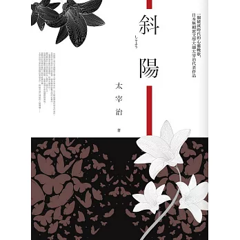 《斜陽》是日本無賴派文學大師太宰治於二次大戰後發表的成名代表作,也是昭和文學的金字塔鉅著,描寫戰後混亂苦悶的社會中,一個貴族家庭的沒落過程,恰如太陽西沉;備受壓抑的女主角則藉著為心愛的人懷孕生子,向傳統愛情觀與道德觀挑戰,重新發現生命的價值與喜悅。